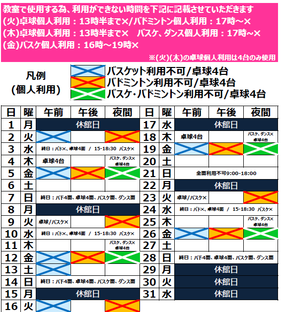 案内表の色付きバツ枠日程、水曜日は利用不可種目に加えて、卓球4台となります