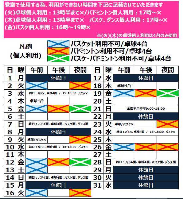 案内表の色付きバツ枠日程、水曜日は利用不可種目に加えて、卓球4台となります