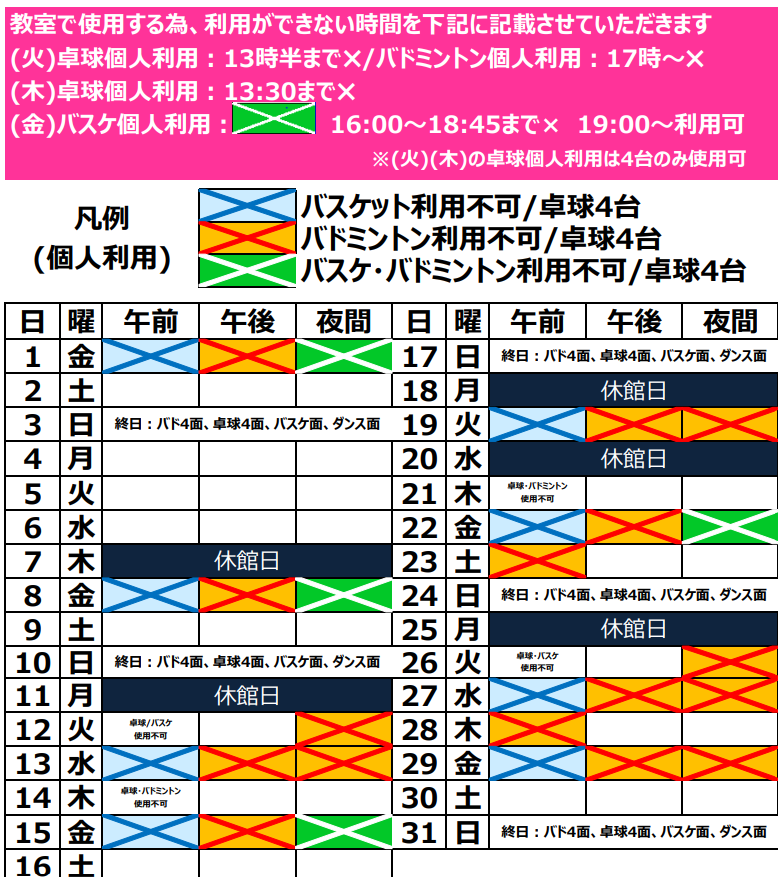 水曜日は利用不可種目に加え、卓球が4台のみの利用となるお日にちがございます。