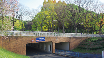 高台の入り口広場から園内へのケヤキ並木の橋です。橋の下は駐車場の通路とサイクリングコースとなっています。